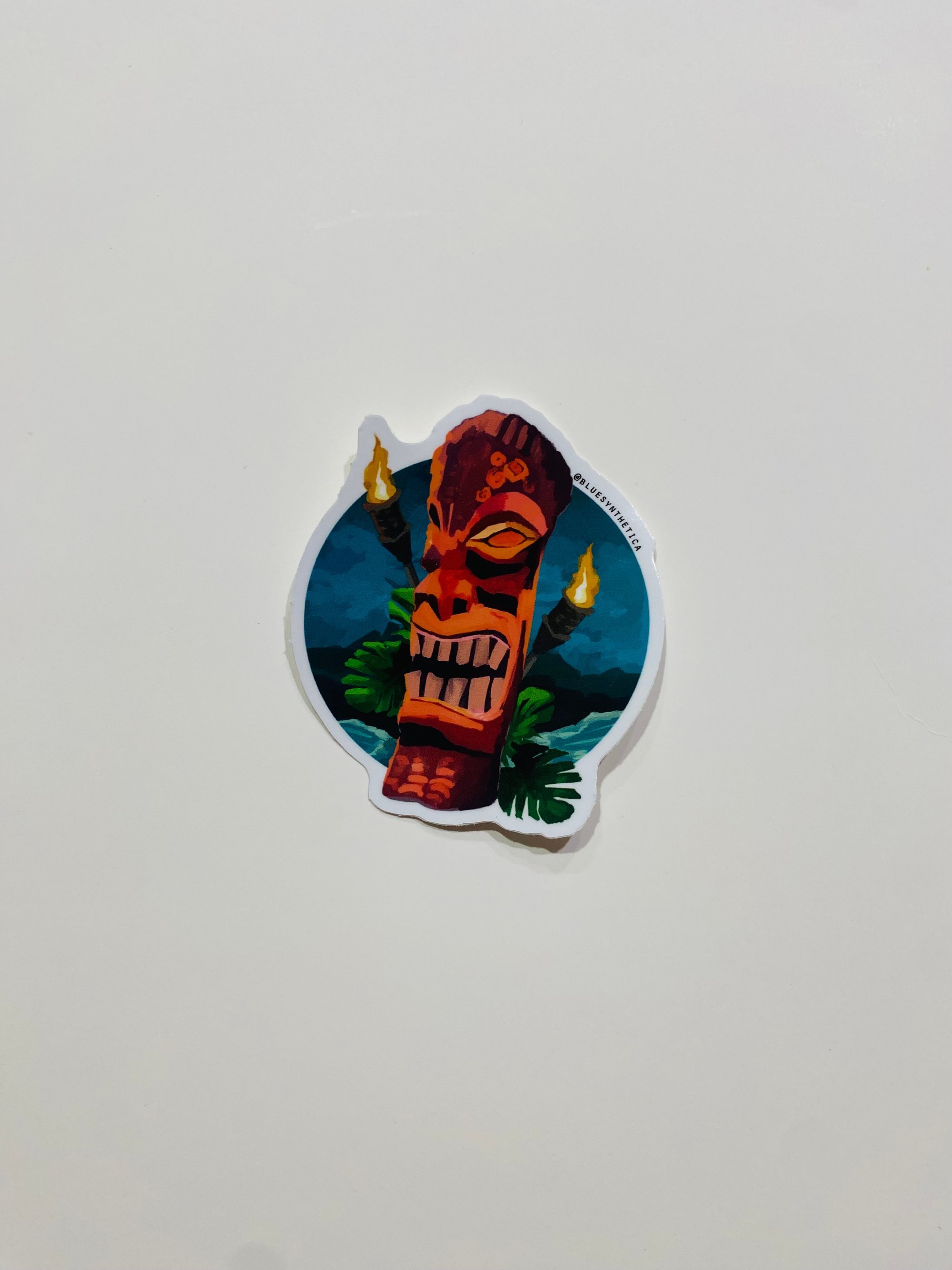 Half man, half god; the Tiki is a fearful and powerful being, often served as a guardian to the Polynesian people. 3” x 3” vinyl sticker.
